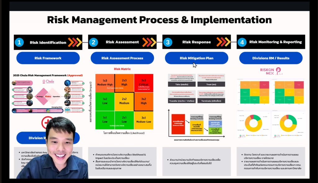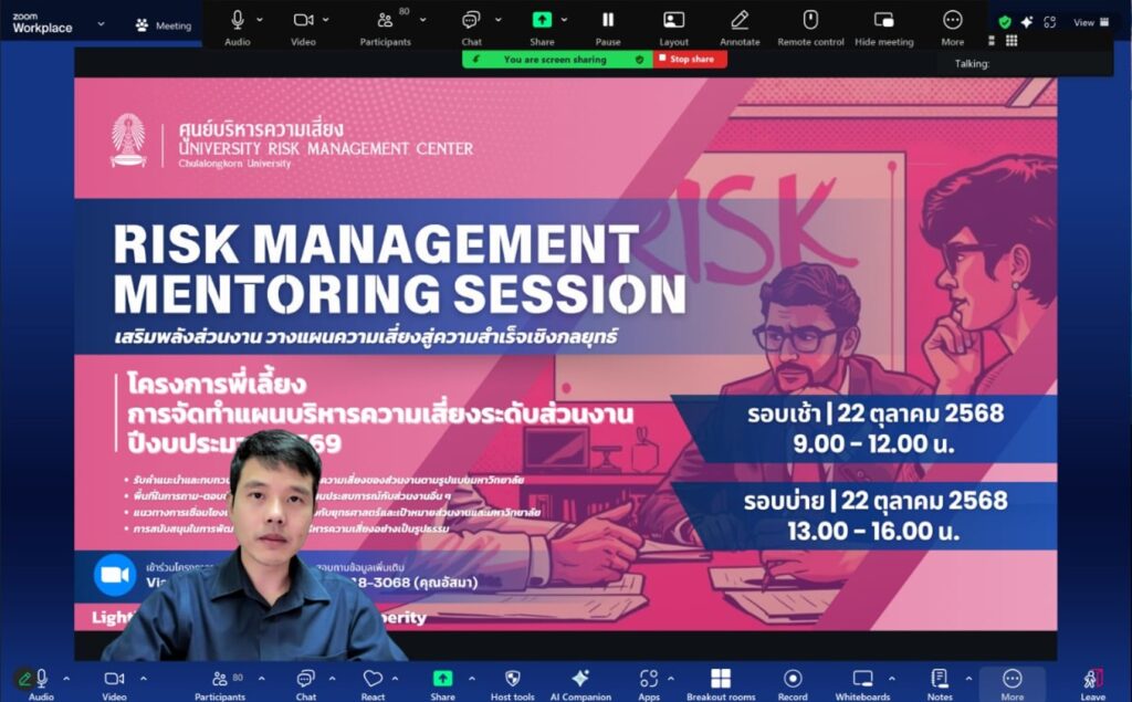 ศูนย์บริหารความเสี่ยง จุฬาลงกรณ์มหาวิทยาลัย จัดกิจกรรม Risk Management Mentoring Session ภายใต้โครงการพี่เลี้ยงการจัดทำแผนบริหารความเสี่ยงระดับส่วนงาน ประจำปีงบประมาณ 2569 เพื่อเสริมสร้างขีดความสามารถของส่วนงานในการจัดทำและขับเคลื่อนแผนบริหารความเสี่ยงอย่างเป็นระบบ สอดคล้องตามตัวชี้วัด เป้าหมายส่วนงาน และทิศทางของมหาวิทยาลัย